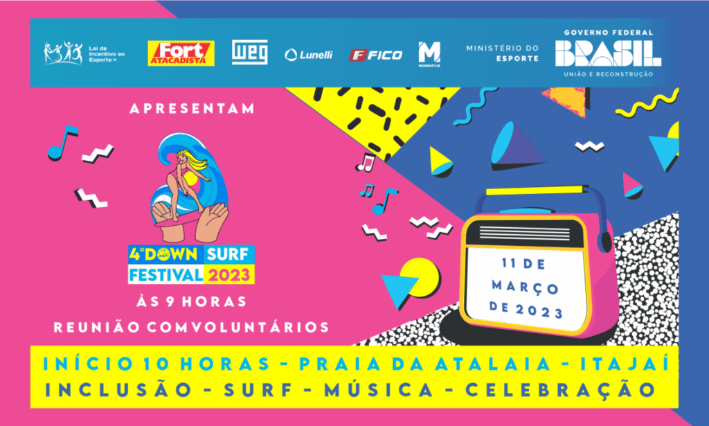 O Governo Federal, por meio da Secretaria Especial do Esporte do Ministério da Cidadania, apresentou a 4ª Edição do Down Surf Festival 2023, realizada na Praia do Atalaia, em Itajaí, com a presença de mais de 500 pessoas, incluindo voluntários, atletas e familiares. O evento foi promovido pela Associação de Surf Praias de Itajaí (ASPI), com o apoio de diversas entidades e patrocinadores. Um total de 126 atletas se inscreveram para participar do evento, com 74 presentes no dia. O presidente da ASPI, José Alberto Luz destacou a importância do esporte para o desenvolvimento físico e intelectual e agradeceu a todos os envolvidos na realização do evento. As fotos e vídeos do festival estão disponíveis nas redes sociais da ASPI.